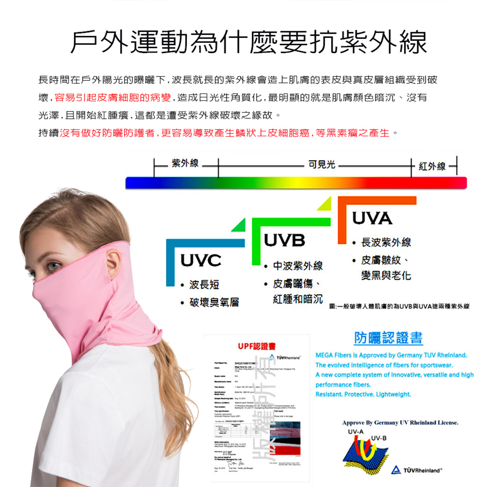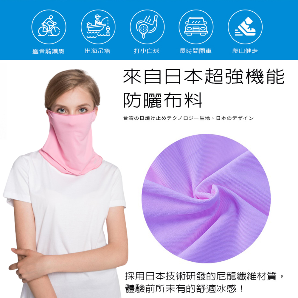 採用專利涼感布料與UPF50+防曬機能,有效阻隔99.9%紫外線,透氣舒適且親膚不刺激,提供臉部與頸部完整防護。