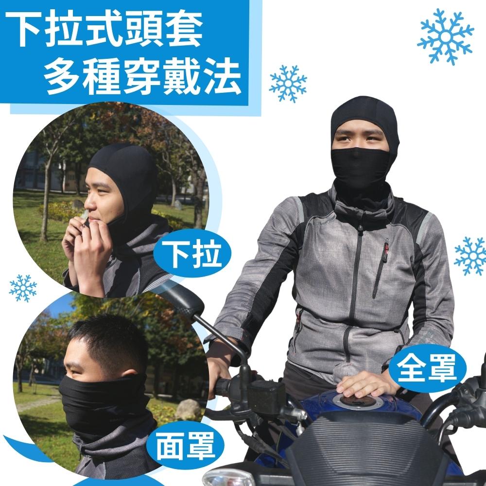 網狀下拉式頭套則是具備了能完全上掀及下拉的功能,在接聽電話或喝水時更加方便,並且於口罩部分採用網狀布料,使呼吸更透氣順暢。