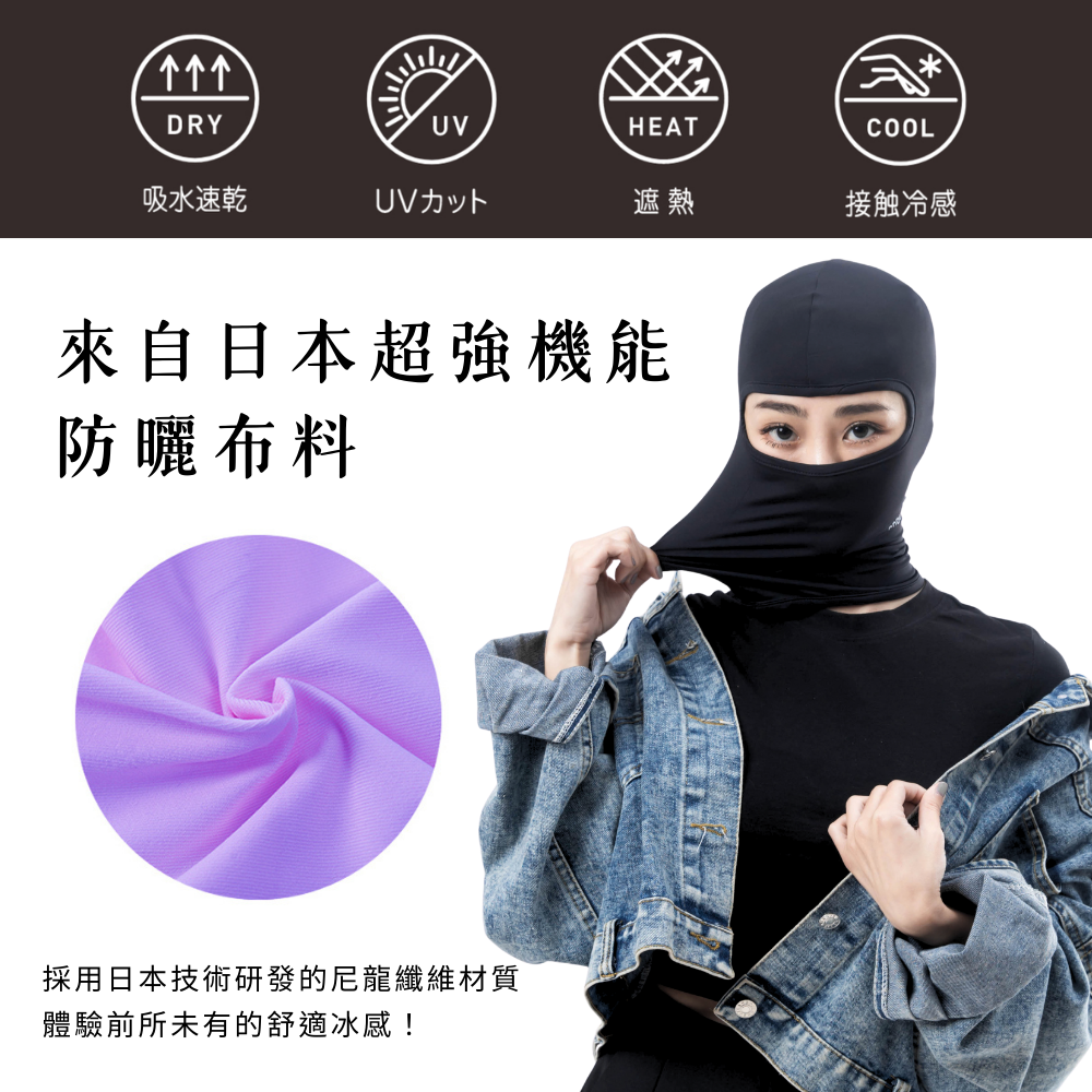專為女性騎士打造的全罩式防曬頭套,兼具帥氣造型與高機能防護。立體剪裁設計能完美修飾臉型與頭型,打造俐落輪廓線條。採用日本涼感技術布料,帶來瞬間降溫3°C的舒適體感,透氣不悶熱、長時間配戴依然自在。