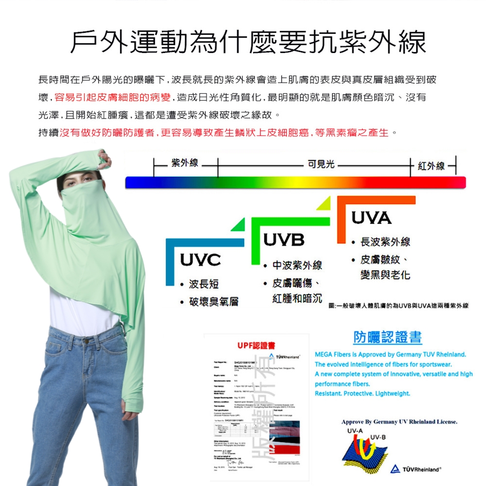 - 面罩式大圍脖設計,臉頸肩 360° 全面防曬